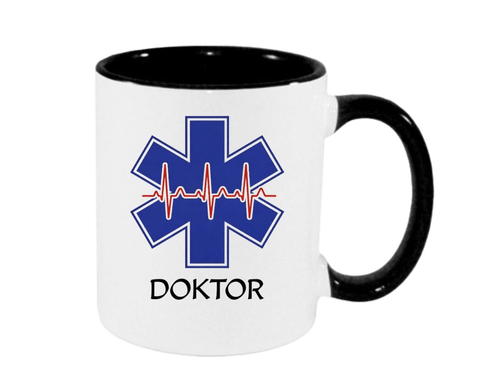 Elegantní hrnek s lékařským symbolem a nápisem DOKTOR. Důstojný doplněk na pracovní stůl do ordinace.