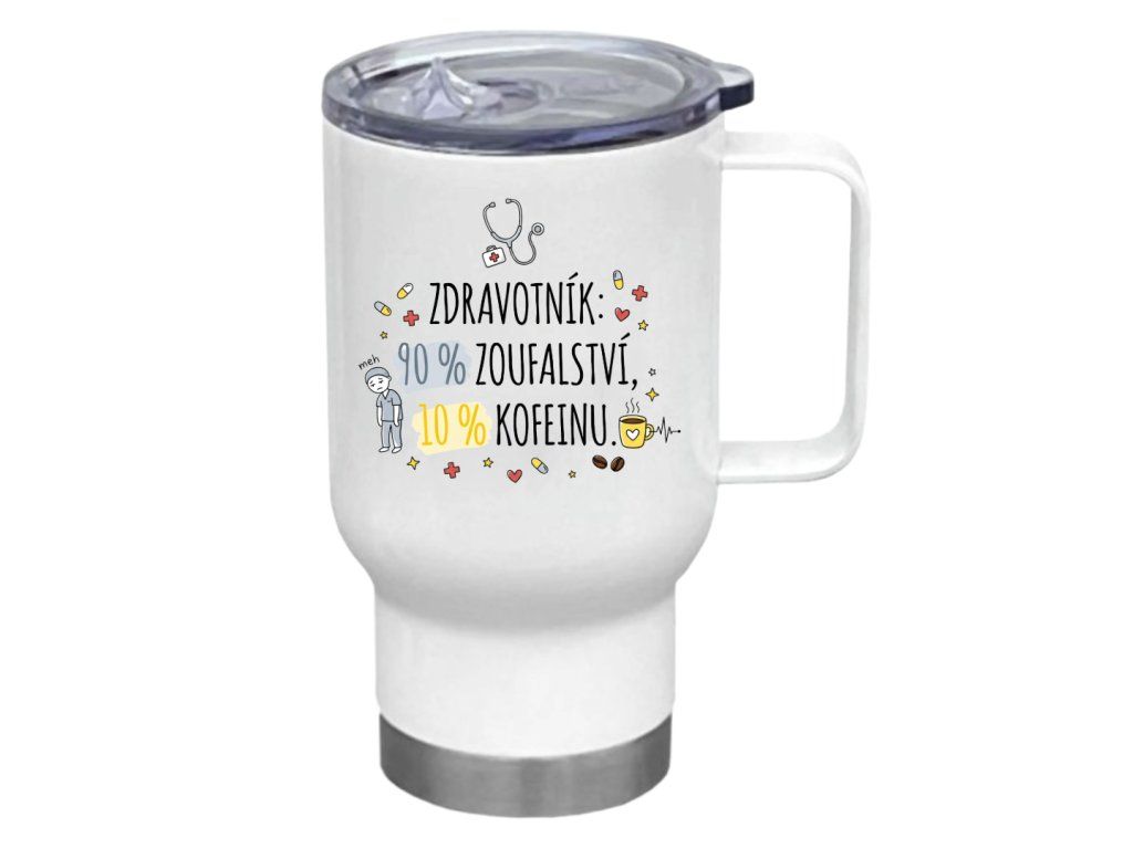 Práce ve zdravotnictví není pro slabé povahy a tento motiv to říká s patřičným nadhledem. Hravé ilustrace stetoskopu, pilulek a unaveného zdravotníka doprovází nápis, který mluví z duše každému, kdo někdy sloužil noční nebo zažil ranní shon na oddělení. Je to vtipná připomínka toho, že v tom nejste sami – a že dobrá káva je občas tou nejlepší první pomocí.