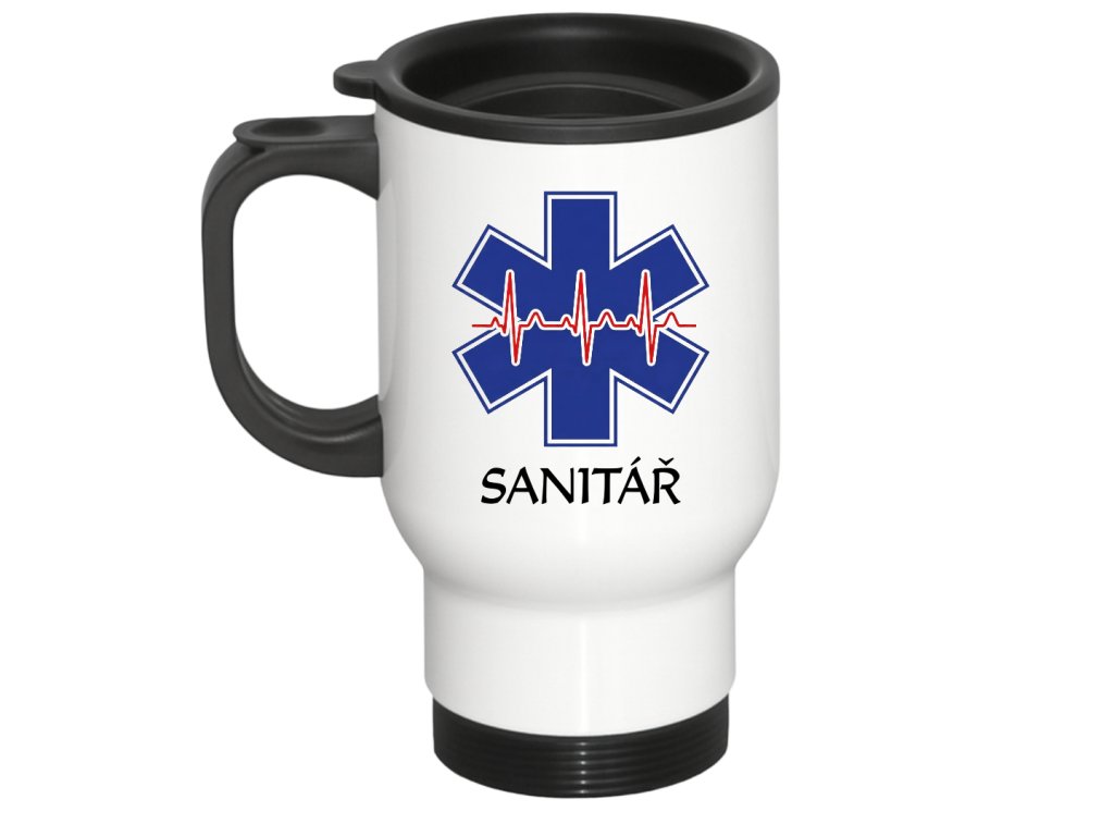 O designu: Klasická modrá hvězda života (Star of Life) s červenou křivkou EKG. Na stříbrném či bílém plášti termohrnku působí velmi profesionálně.